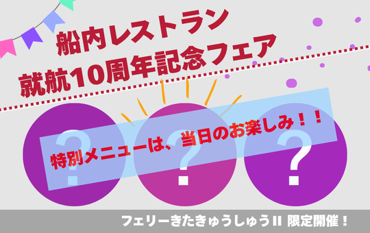 フェリーきたきゅうしゅうⅡが就航10周年を迎えるにあたり、船内レストランでは就航10周年記念フェアを実施しますので、フェリーきたきゅうしゅうⅡをご利用の皆様はぜひご利用ください。