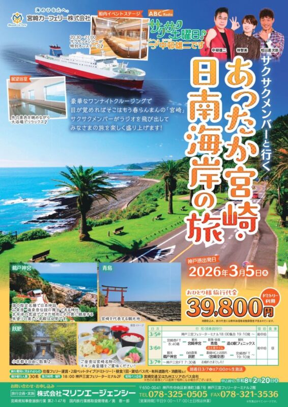 この度、関西で放送中のABCラジオ番組「サクサク土曜日 中邨雄二です」と宮崎カーフェリーがコラボし3月5日(木)神戸港出発 サクサクメンバーと行く「あったか宮崎・日南海岸の旅」を販売することになりました。詳しい情報は1月21日(水)10時までお待ちください。